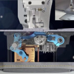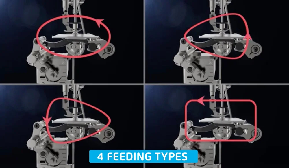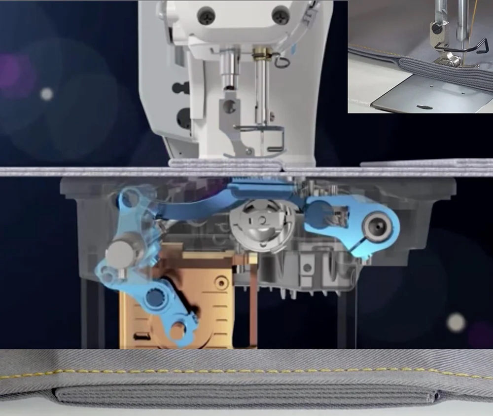 Thanks to a sensor, the machine detects a different thickness and modifies the movement of the jaw, to always maintain the same stitch length even on unevenness.
